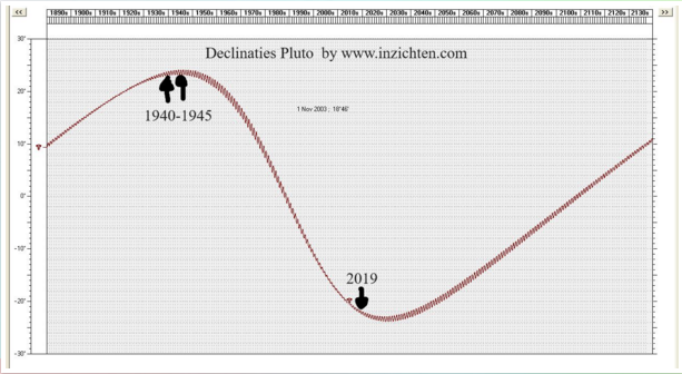 Ik heb een aantal jaren de verticale klimming van planeten astrologisch bestudeerd. De meest treffende informatie die ik daarin tegenkwam is de verticale beweging van Pluto. Pluto regeert over macht/onmacht en de grafiek laat ons zien dat we tijdens de 2de wereld oorlog in de piek van Pluto in de buitenwereld waren (top van de curve in de grafiek) en er een beweging was naar controle en dominantie van de wereld. Nu zijn we aangekomen bij het keerpunt aan de onderkant van deze grafiek. Hierbij gaat het om macht te verkrijgen over de binnenwereld. Als je zelf die macht over jouw binnenwereld niet neemt, dan wordt deze ingenomen door de ander. Daarin passen de ‘virtual reality’, chippen, controle en manipulatie via sociale media, 5G enz. De horoscoop van 2019 en van de verduisteringen in 2019 laten zien dat dit de jaren zijn waarin de basis hiervoor wordt gelegd, met de piek tijdens de Saturnus conjunctie met Pluto op 13 januari 2020. In toenemende maten is er dus druk de komende tijd om macht en controle te krijgen over je eigen binnenwereld.