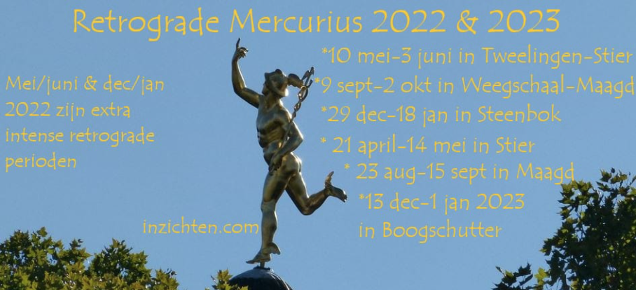 De retrograde periode begint op dinsdag 10 mei 2022 en start in Tweelingen. En omdat de stroom van Bronenergie ook in Tweelingen staat kan er in het komende jaar opnieuw (net als afgelopen jaar) een grote of kleine correctie komen op het gebied waar Mercurius over regeert en dat is: handel, beurshandel, verkeer, media, communicatie, informatie uitwisseling, humor, hersenen, studie, onderwijs en alles waar kinderen bij betrokken zijn. Het gaat om het herstellen van de kinderlijke onschuld en zuiverheid in ons allemaal en voor alle kinderen of juist de schending daarvan. Mercurius wordt niet beïnvloed door een hoog moraal. Hij heeft geen eigen mening of visie, maar brengt slechts over wat wordt uitgezonden van de hemel naar de aarde en andersom. Hij maakt handig gebruik van wat hem voor de voeten komt en pikt zo zijn graantje mee. Ethiek en moraal zijn voor het komende jaar opnieuw heel laag en daardoor zullen we extra vaak situaties zien waarin met handigheidjes gebruik of misbruik gemaakt wordt van omstandigheden. Voor het lichaam staan vooral de zintuigen extra onder druk en die kunnen transformaties doormaken. Zoals extra nieuwe zintuigen die mogelijk wakker worden, zoals bijvoorbeeld telepathie of het spreken van een lichttaal (Mercurius in Tweelingen Maansverduistering 16 mei 2022 1ste huis. Gecorrigeerde zwarte Maan staat in Tweelingen 2de huis.)