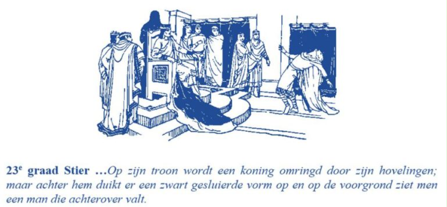 Jouw innerlijke koning hoort eigenlijk zonder belemmering te stralen als een Zon. De manier waarop jouw innerlijke koning werkelijk functioneert, kan met de energie van deze BloedMaansverduistering zichtbaar worden. De betekenis van de graad van de dierenriem die hier bij hoort, laat met de bovenstaande afbeeldingen zien wat de kracht is die de ware schittering van de innerlijke juwelen blokkeert. Je kan de afbeelding en informatie van deze astrologische graad op verschillende manieren uitleggen. Er staat een gesluierd zwart figuur achter de koning, die hem van alles influistert en invloed uitoefent op het functioneren van de koning. Dit kunnen astrale invloeden zijn, die je zonder dat je dit weet beïnvloeden en besturen. Maar soms als er honger naar macht en controle is, dan kan er een bewuste en berekenende beïnvloeding zijn vanuit donkere verborgen niveaus. Doordat het bewustzijn en licht naar buiten gaan stromen, worden ze zichtbaar en voelbaar. Dit betekent dat er een diepe zuivering en eerlijkheid nodig is om het ware, zuivere Zelf te ontdoen van belangen, invloeden en ook beïnvloeding van buitenaf. (Boek gebruikt niet geciteerd: Beeldengraad van de dierenriem van Helene W. en Willem A. Koppejan ISBN: 90-202-1673-2. Noordelijke Maansknoop op de 23ste graad van Stier op de Ascendant conjunct Zon en Uranus.)