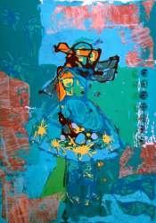 De monoprint Orisha vertelt over een vrouw die graag de schoonheid van communicatie laat zien, met gevoel en zachtheid maar wel met kracht en trefzekerheid. Ze voelt zich helemaal lekker in de omgeving en met zichzelf, ze is een mooie vrouw.